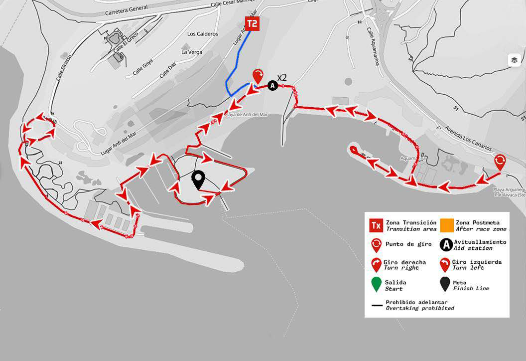1.900m con salida y llegada en la playa de Anfi y sobre un recorrido a dos vueltas.
